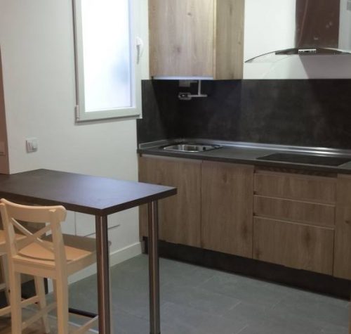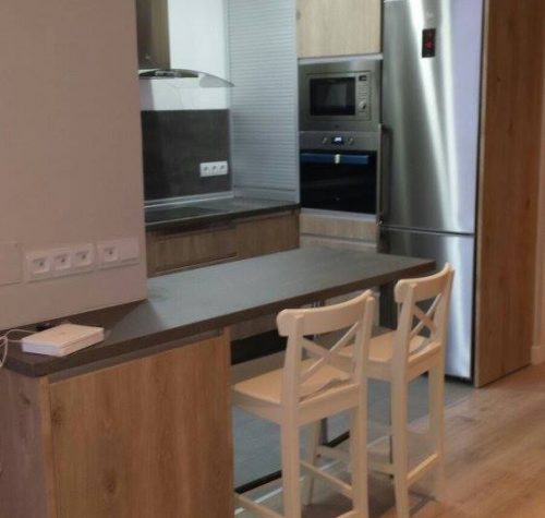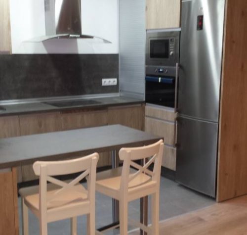 Muebles de cocina con puerta laminada color madera con nudos y tirador integrado de aluminio. Mueble con persiana sobre encimera. El suelo está combinado con porcelánico y suelo laminado en los mismos tonos que las puertas.