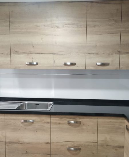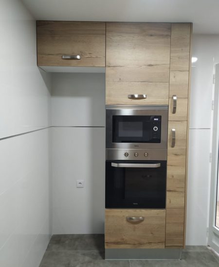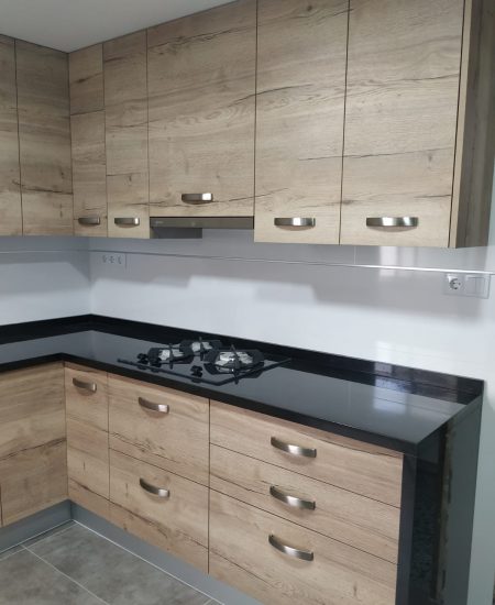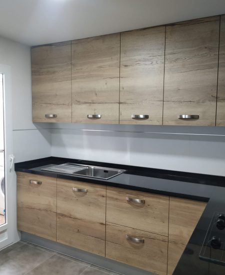Cocina con puerta laminado halifax natural veta horizontal y asa niquel satinado. Encimera de granito negro pulido. 08/06/2021 | Cocinas, Proyectos