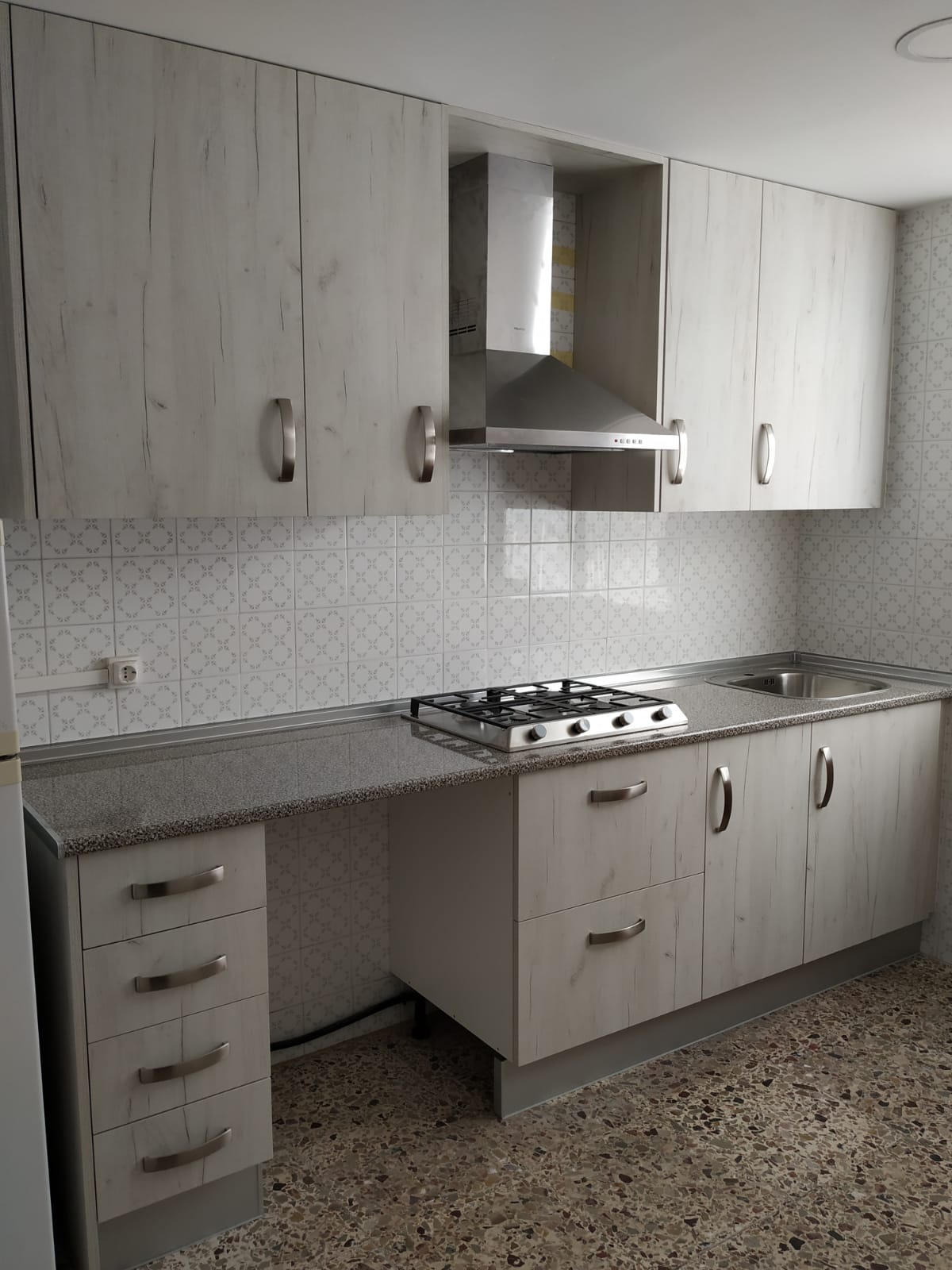Cocina puerta de madera roble plafón liso con encimera granito blanco cristal