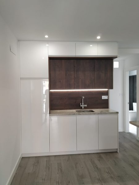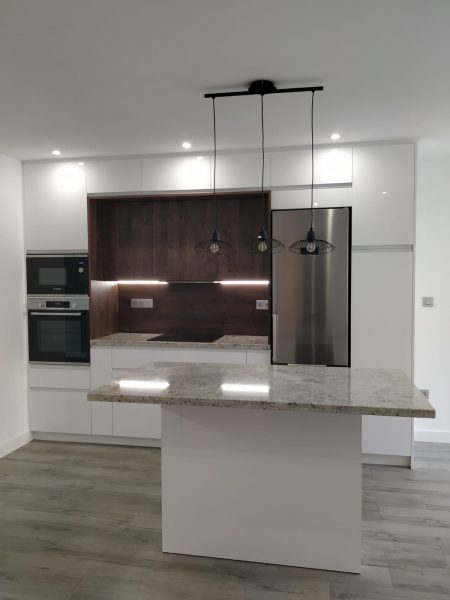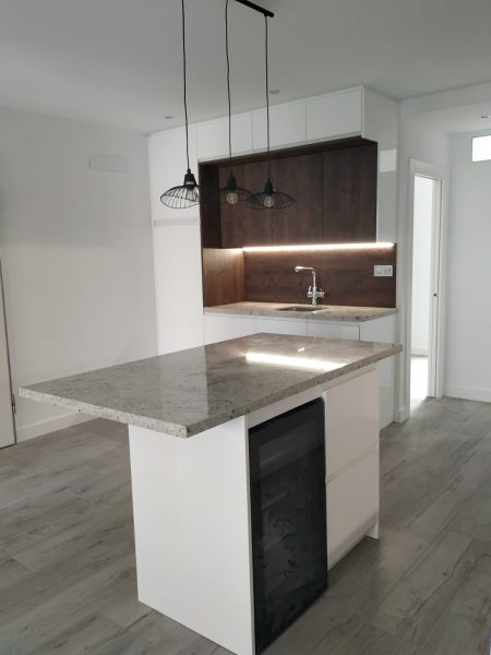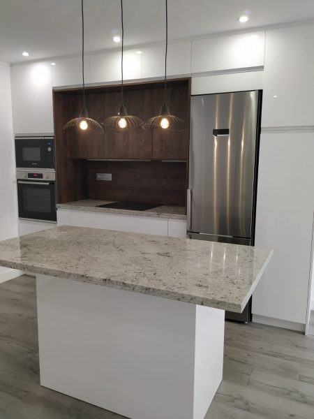 Cocina con puerta en PET blanco brillo combinada con laminado oscuro y encimera de granito warwick rubi pulido. Muebles altos en dos alturas y acabados. 14/08/2019 | Cocinas, Proyectos